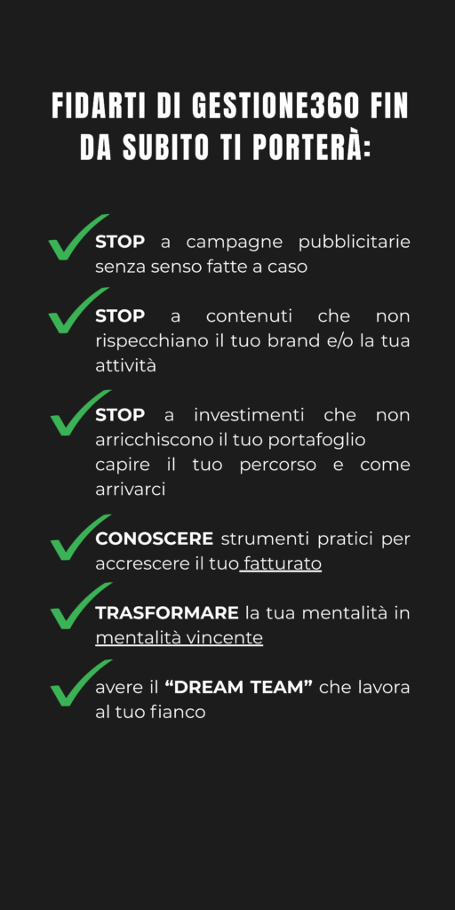 Parti dall’applicare un metodo interno che porterà cambiamenti a te e alla tua attività e arriva all’applicazione di un metodo esterno che ti consentirà di avere successo sui social e che ti genererà conversioni anche mentre dormi.